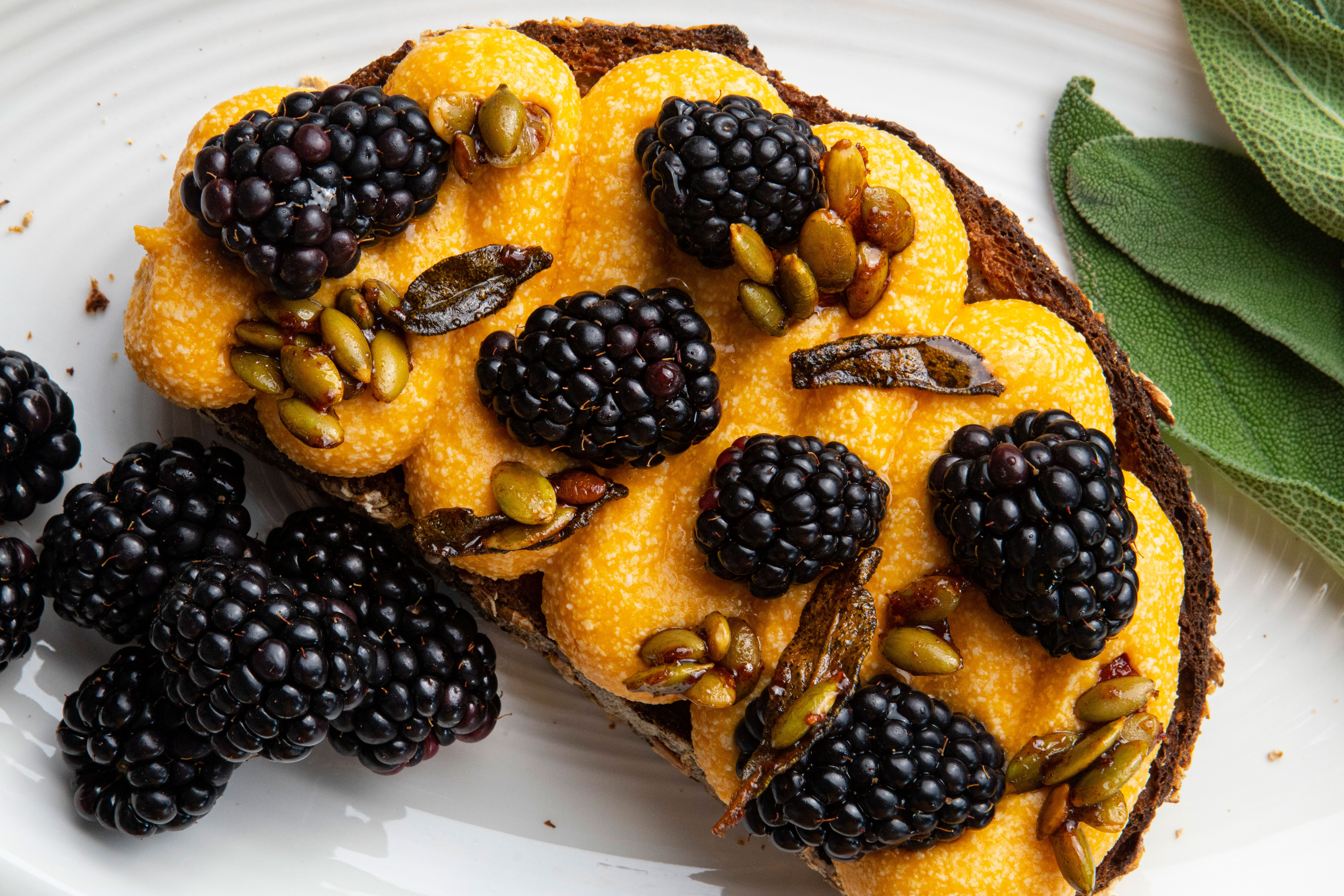 Who knew that sweet fresh blackberries, ricotta cheese, and baked pumpkin could go so well together? You can bake the pumpkin and candy the pepitas (pumpkin seeds) ahead of time. Then all you need is a few minutes with a food processor and a toaster and you have a healthy, delicious breakfast or afternoon snack!